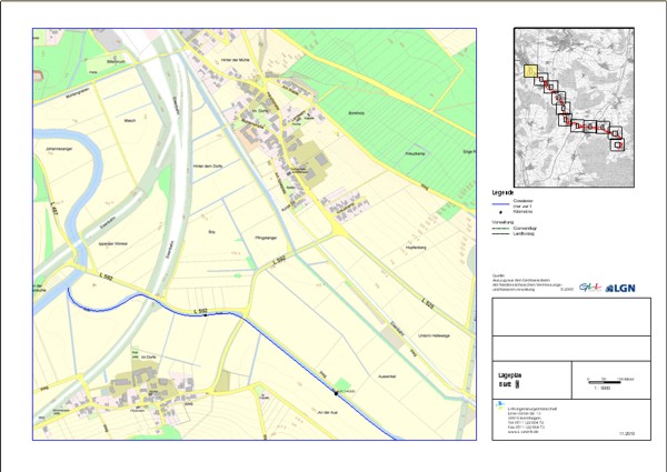 Mit der Übersichtsfunktion blendet sich das gesamte Projektgebiet mit den einzelnen Gewässern ein und es lässt sich ein konkretes Gewässer auswählen. In der Map-Ansicht lassen sich individuelle Lagepläne erstellen und verwalten. Neben den inhaltlichen Elementen ist auch eine Gestaltung von Legenden und Stempelfeldern möglich. |